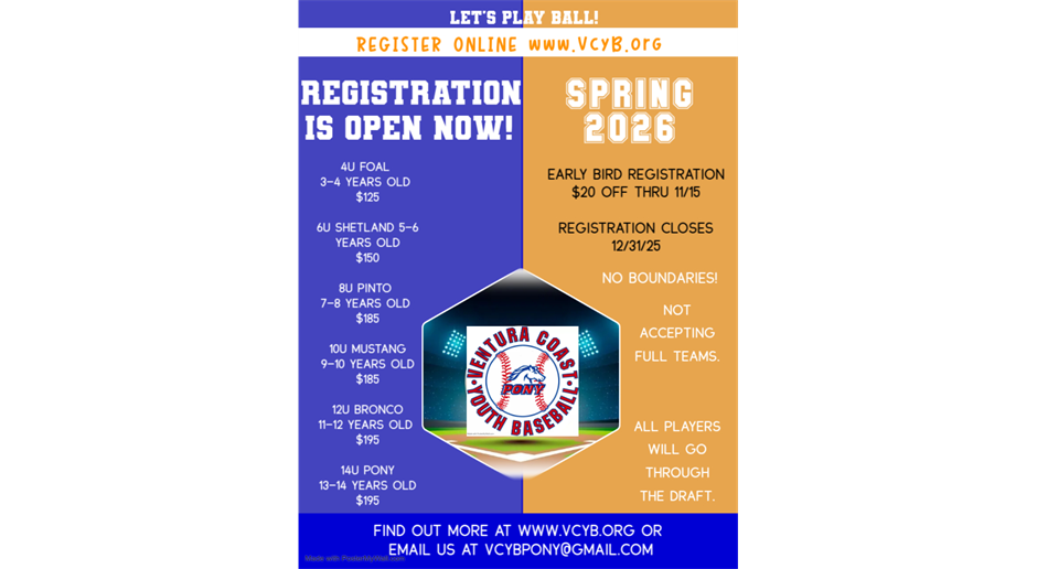 Join us for our monthly Board Meeting.6:30pmVentura Coast Youth Baseball Clubhouse(Above snack bar)